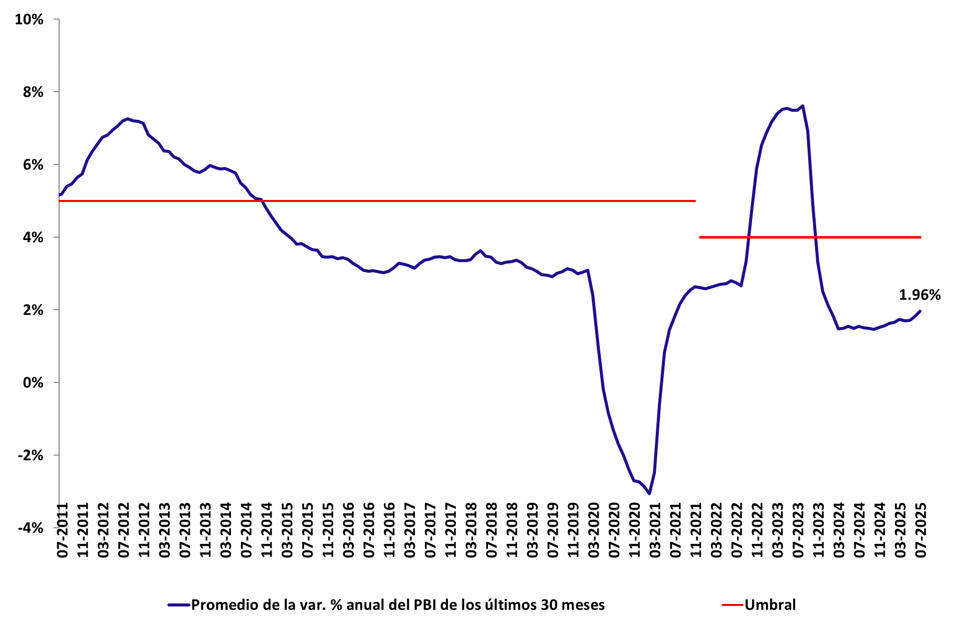 1) Con el resultado del PBI de Junio de 2025, el promedio de la variación porcentual anual del PBI de los últimos 30 meses se ubicó en 1.96%.