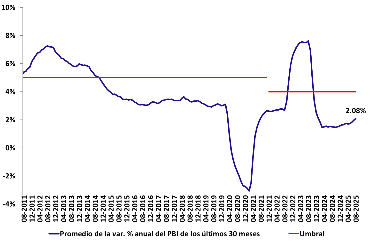 1) Con el resultado del PBI de Agosto de 2025, el promedio de la variación porcentual anual del PBI de los últimos 30 meses se ubicó en 2.08%.