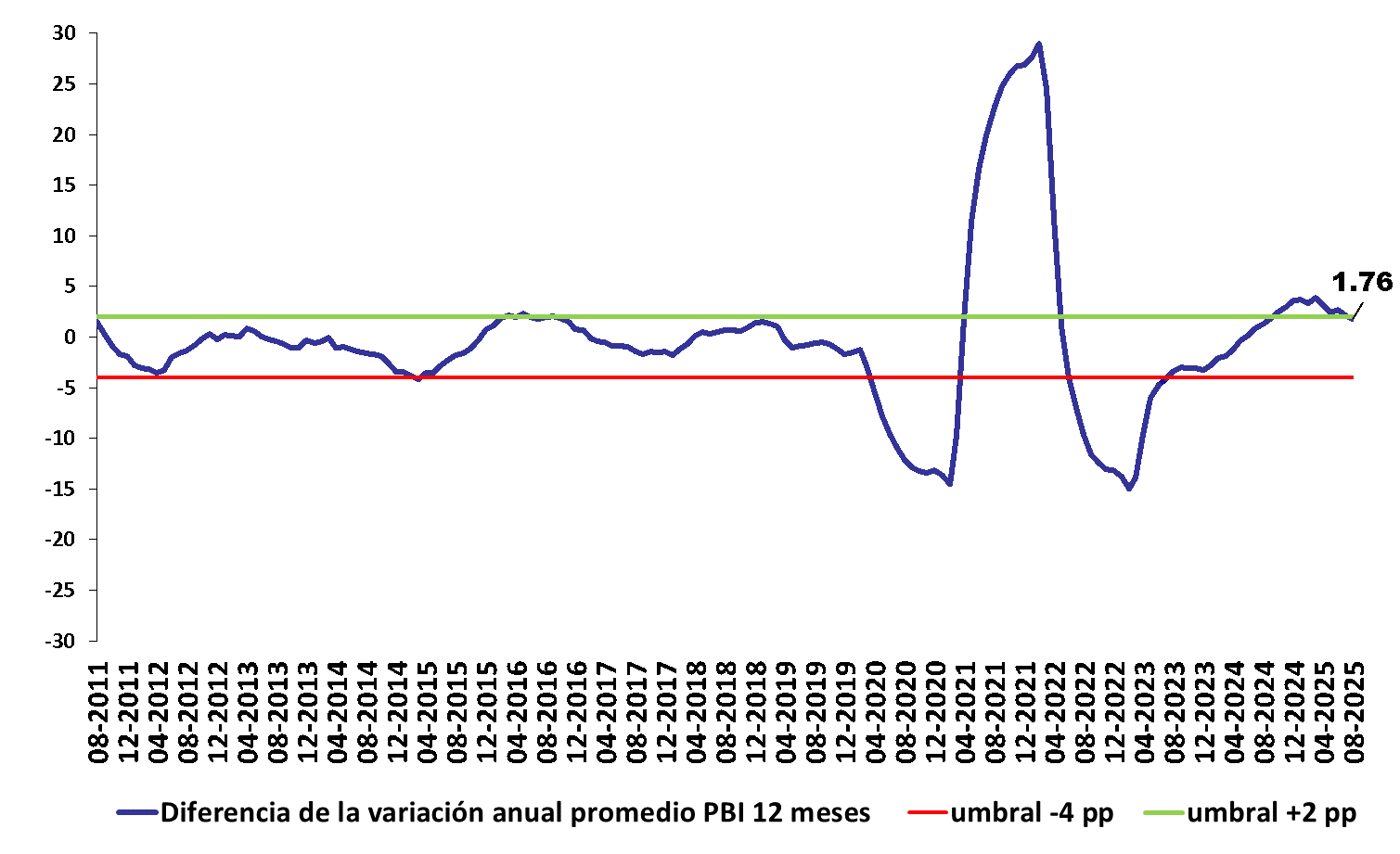 2) La diferencia entre el promedio de la variación porcentual anual del PBI de los últimos 12 meses, evaluado en agosto de 2025, y el promedio de la variación porcentual anual del PBI de los 12 últimos meses, evaluado en agosto de 2024, fue de 1.76 puntos porcentuales.
