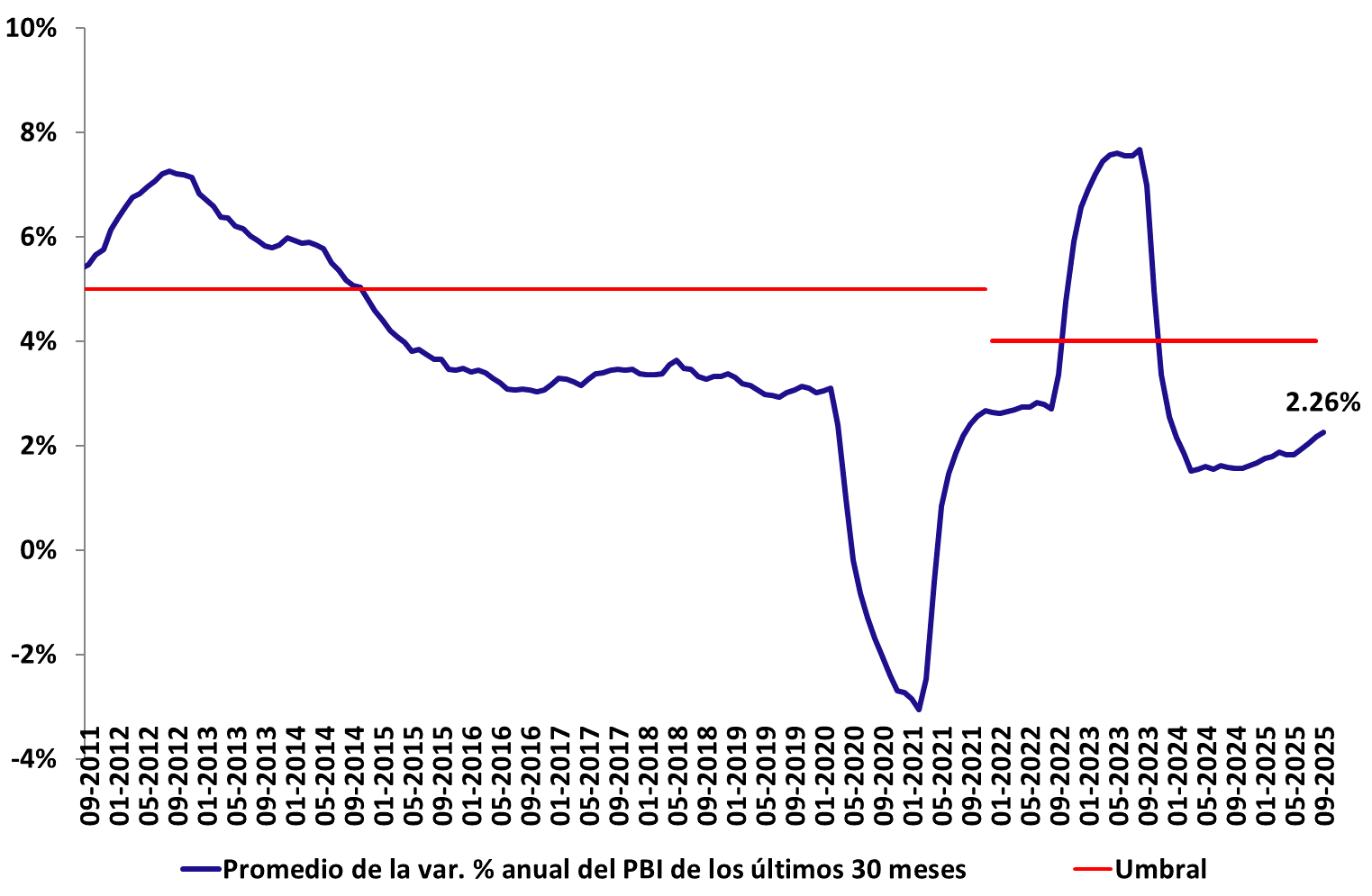 1) Con el resultado del PBI de Septiembre de 2025, el promedio de la variación porcentual anual del PBI de los últimos 30 meses se ubicó en 2.26%.